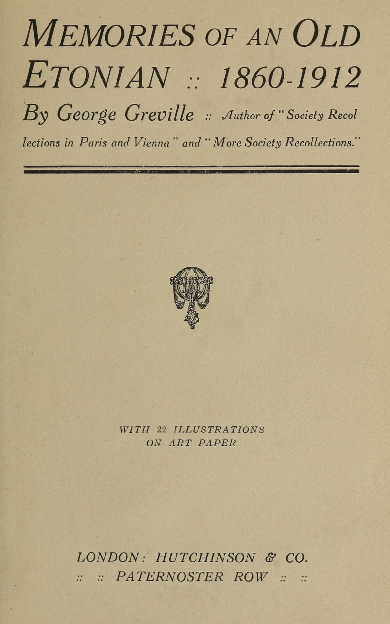 | I go to Eton—New Boy Baiting—My House Master—Mr. James’s “Jokes”—My Room at Eton—Some Eton Masters—A Disorderly Form—Lacaita’s Silk Hat—“Billy” Portman[viii] | |