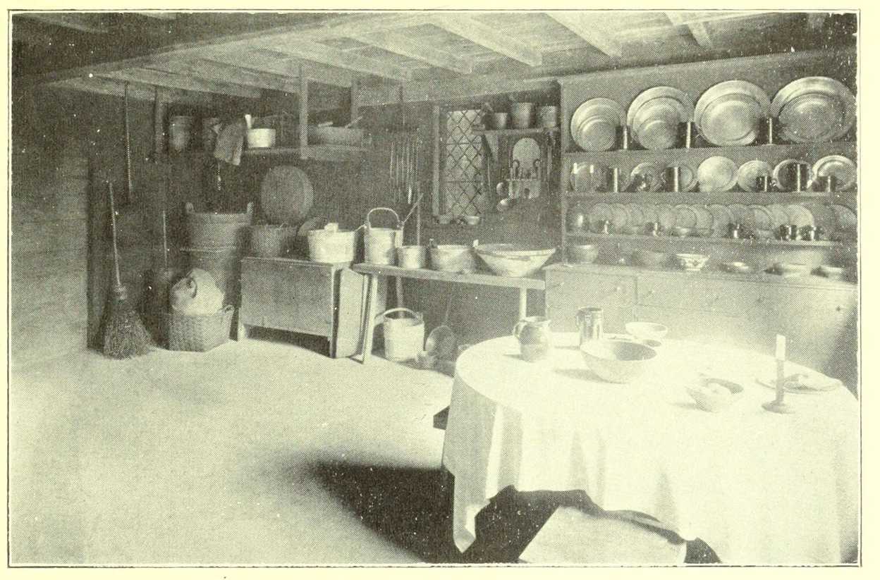 Corner of the kitchen showing dresser with its “dress of pewter,” wash bench, meal chest, wooden ware, etc.