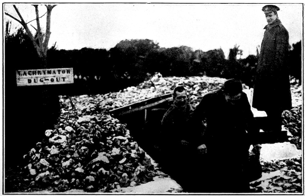 A detail, which needs care and gets it, is instruction in self-defence against gas. Lachrymatory gas is comparatively a trifle. The men are practised in walking through an open trench full of the heliotrope smell of the gas, and come out shedding tears and laughing at the far end. The more serious poison gas is let loose in a tunnel-like chamber through which every officer and man bound for the Front must pass. The foul stuff in 8the chamber is some hundred times as dense as any gas to be met in actual warfare. But if the man’s gas mask is in order, and he uses it as he has been told, he suffers no inconvenience while passing through or afterwards, and thenceforward no German gas has any terrors for him.