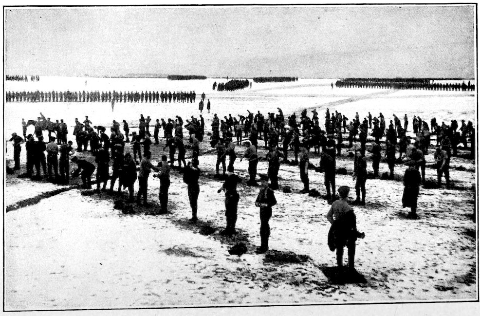 Speed in sandbag-filling, for trench fortification purposes, is extremely important; in some battalions it is encouraged by systematic competitions, the competitors working in pairs. Note, in the photograph of men aiming or loading, in a lying position, the uniformity with which their heels are 9kept down. In a badly trained draft several heels would be sticking up, inviting enemy bullets.