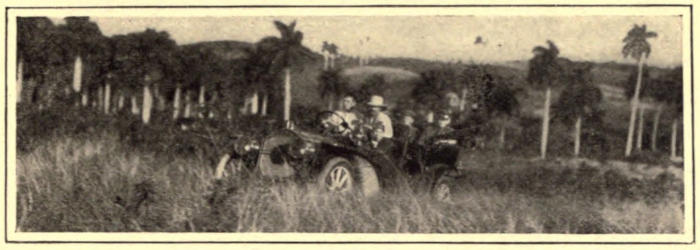 The low clouds in the west, reflecting the crimson glory of the sun’s farewell glance, spread a woven gold mantilla on the naked shoulders of a grim, forbidding world, and the motor car sank, helpless, into the deep mud as if, also, its day was done. We hesitated before we went to work. We knew that, somewhere, away off behind the big, dark hills, was Santa Clara, food, and shelter. We knew that, somehow, we would raise the car from the enveloping mire. We had accomplished more difficult tasks, yet we hesitated. The flaming clouds darkened into livid fires which flickered and went out. There was no twilight. In the gloom of ominous night, broken only by the slender rays from an oil lamp, we took a new reef in our nerve and began another round of [70]the desperate, elemental fight against the mud. One of us searched for long poles to use as pries. Another vainly sought to make a solid foundation for the jack underneath the car. The others collected rocks. We had previously cursed these ever-present boulders, which we now welcomed. All worn by the day’s hard work and with a big job before us, we stopped, enchanted, as from the far-away hills came the clear, melodious “ah, ohs!” of the voceo de ganado—the silver tones of the native Cuban, calling home his cattle.