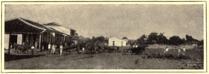 Often a dozen yelled in chorus. Failing to budge the foremost cart, all ceased their efforts [93]and, wildly gesticulating, argued and wrangled while more bulls were brought from a rear cart and hitched to the one stuck in the mud ahead. It took a dozen of the wide-shouldered, powerful bulls, pulling all together, with all their might, to drag each cart to the hard ground in the mill yard. In the meantime, scores of idle mill laborers, representing every type which the island affords, lounged around, dividing their attention between the curious struggle and the strange sight which we made in our motor car. While they watched with curious eyes, they pared long sugar canes with skillful flips of their machetes and sucked the thin sweetness.