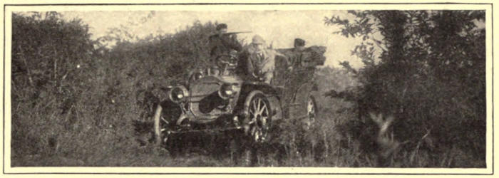 Going back from the sugar mill, in the early morning, to the farmhouse where we had left El Toro, we noticed two chances of crossing the muggy river where automobiling in Cuba had ceased the night before. One place was wide, low, and flat. It meant long hours of tedious filling in with brush. The other was a narrow cut between two precipitous walls. We chose [92]the cut, for it required only a few minutes to fill the narrow bottom with enough brush to allow the car to be driven down one hillside and up the other as fast as all its power could take it.