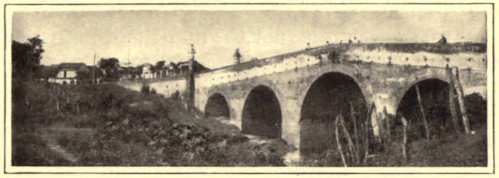 About the time we had given up hope for the day, we found a bridge and then another, and, at last, we found the promised highway. It was worn and full of holes, but it was high, hard, and almost level. The clouds parted and the sun beamed a bright farewell, just before it dropped from sight behind the mountains. High on a neighboring crest was silhouetted against the glowing, copper-colored sky a lone block house. Below it, between a pair of spreading laurels, stood the ruins of a great mansion which had been the quarters of some luckless Spanish general who allowed the Cubans to shoot him out of house and home. A massive stone bridge, weathered by the many years throughout which it had served generation after generation, led us over the last river. We climbed the last hill. Below us spread the red roofs of Sancti Spiritus.