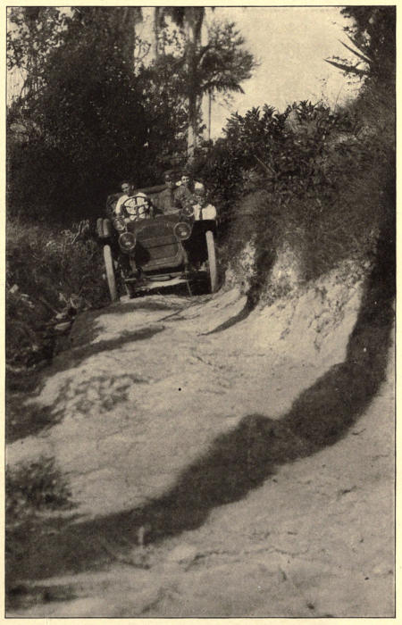 A mere path straggled over and among the hills and was lost in the great patches of native rock. We began to take the country seriously. Trepidation mingled with curiosity. Once in a while a good sort of winding dirt road gave promise of speed, only to change, like a dissolving lantern slide, to a staggering trail over the rocks or between them. The stones increased in number and in size. Each occasional break in the bumping, swaying, swinging, car-racking, tire-tearing progress became shorter. We forgot the stately palms, the queer huts, and the beautiful red flowers. We did not even hear the evening song of the many birds.