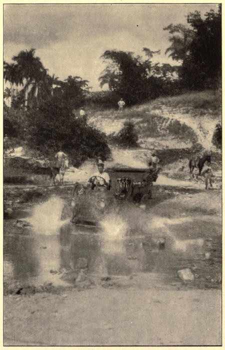 At last an opening was effected. Straddling the gaping ruts, with wheels twisted to the full limit of the springs, Waldon drove the car out of the mess. Leaving behind a great babel of unintelligible tongues, we went on our way toward Placetas. Sliding down embankments, crossing pools, digging trenches to obtain a footing for the wheels in the roughest ravines, we reached the bed of a dried river, whose hard bottom held only occasional pools of water made by the recent rains. We followed this to a hill, from whose brow a level path led to Placetas.