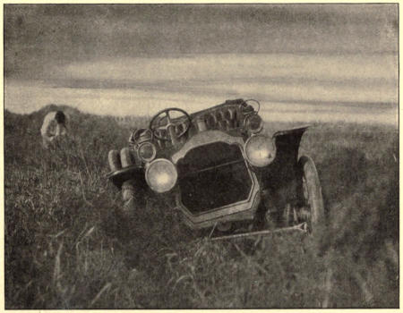 The same old acts were rehearsed with new scenery. Down gullies we twisted to wide rivers, forded them and scrambled up the banks, [102]only to drop again into marsh or perform on the high spots over ruts that the rain could not wash out, but which it made slippery beyond description. We did a lot of driving through fields. Where there were fences, they were either of stone or barbed wire. The latter consisted of two or three loosely drawn strands of wire, held by an occasional permanent post, but, principally, by loose sticks. We cut the wires with pliers, dropped the fence, drove into the field, picked up the fence, joined its loose ends as best we could and drove on. In order to go a mile or two we sometimes had to pass through a dozen fields and cut a dozen fences. The fields which we preferred to the trail were either plowed ground or simply rough land which never had been tilled. Always, it was covered with stones and it was never level.