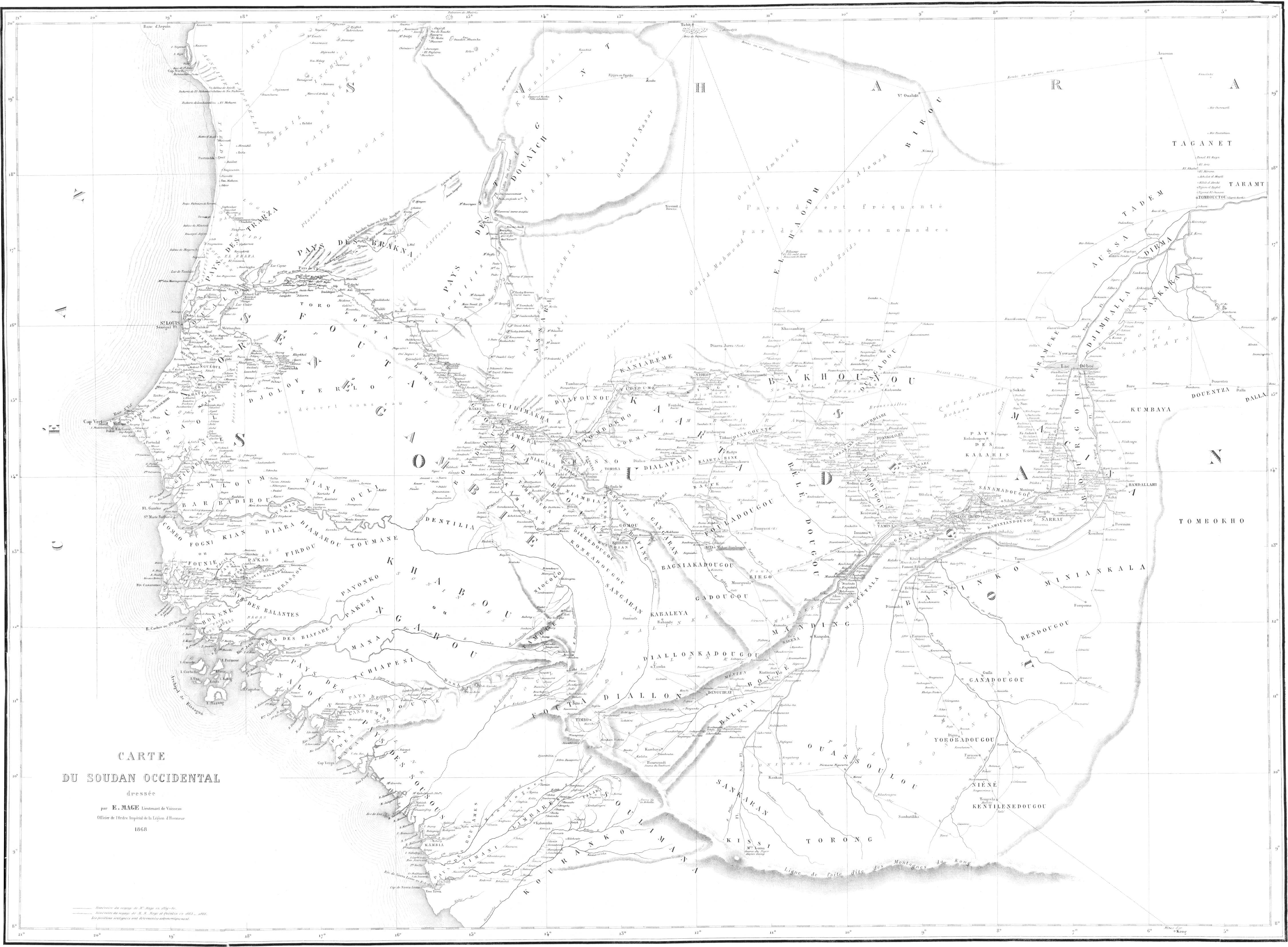 Plus j’approfondissais la question, plus je m’effrayais de l’ignorance dans laquelle on était des points mêmes qui touchent à notre[7] colonie. Au-dessus de Médine, on n’avait de renseignements que par le voyage de M. Pascal, qui s’était avancé fort peu au-dessus de Gouïna[4]. J’avais moi-même visité ce point quelques mois après lui ; mais au delà, à quelle distance se trouvait Bafoulabé[5] ? Ce lieu était-il habité ou non ? A quel endroit trouverais-je des partisans d’El Hadj ? Quelles populations amies ou ennemies aurais-je à traverser pour y arriver ? Quelles ressources enfin trouverais-je dans le long voyage que j’allais commencer ? Toutes ces questions se levaient devant moi, et plus je voulais les éclaircir, plus je lisais, plus je fouillais dans les documents que me fournissait la bibliothèque du Sénégal, plus je trouvais partout le doute ou l’ignorance.