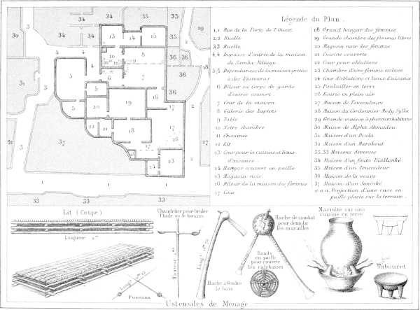| Chapitre XXXIX. — Départ de Ouosébougou. — Siradian. — Hofara. — Elingara. — Boulal. — Sékhello. — Je suis pris pour un Maure. — Bagoyna. — Marques de l’épizootie. — Route pour Touroungoumbé. — J’arrive épuisé. — Bon accueil. — Pillage de Maures. — En route sur Nioro. — Entrée triomphale. — Mustapha. — Son accueil. — La ville. — Séjour. — Tentative pour me retenir. — Position délicate de Mahmadou Abi. — Le schérif de Fez. — Visite aux frères d’El Hadj. — Je pars. — Cadeaux à Mustaf. — Échange de bons procédés avec Mahmadou Abi. — Départ de Nioro. — Médina. — Les trois Gadiaba. — Youri. — Petite pluie. — Je pars sans mes guides. — Birou. — Aspect des terrains. — Ali, notre guide, ambassadeur d’Ahmadou. — Ouagadou. — La vallée du Guidi-Oumé. — Khoré. — Le Kirigou. — Khassa. — Togno. — Fanga. — Niogoméra. — Tanganaya. — Takhaba. — Niakhatéla. — Makhana. — Route en forêt. — Tornade. — Inondation. — Passage d’un torrent. — Mounia. — Route sur Kouniakary. — Séjour dans ce village. — Tierno Moussa. — San Mody. — Situation politique du pays. — Dernière route. — Arrivée à Médine. — De Médine à Saint-Louis et en France | 633 |