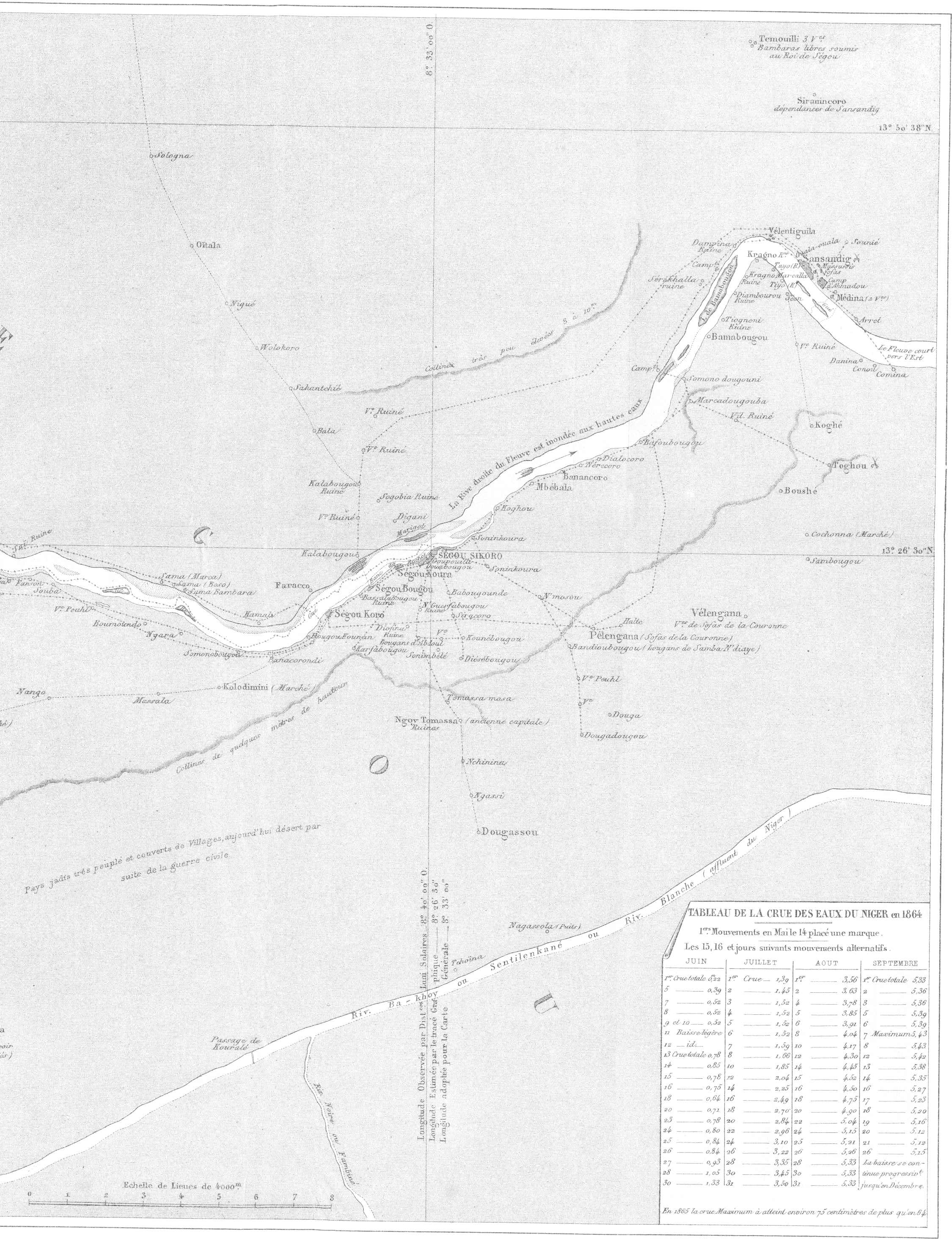 « Telles sont, en un mot, les conclusions du travail si important que M. le colonel du génie Faidherbe vient de faire connaître[1], et si on jette les yeux sur une carte, on est tout de suite frappé de la grandeur de ce projet ; mais avant de se lancer dans les dépenses d’une ligne de postes sur environ quatre-vingts lieues d’étendue, qui séparent Médine de Bamakou en ligne droite, il me semble qu’il faudrait au moins savoir exactement où l’on va, avoir une carte bien exacte du cours du Niger, savoir si les caboteurs pourront naviguer entre les cataractes de Boussa et Bamakou et faire dériver les produits des marchés africains sur Boussa, où nous pourrions établir alors un comptoir dans lequel ces produits seraient reçus et dirigés sur France par des navires qui viendraient les chercher le plus haut possible dans le bas Niger.