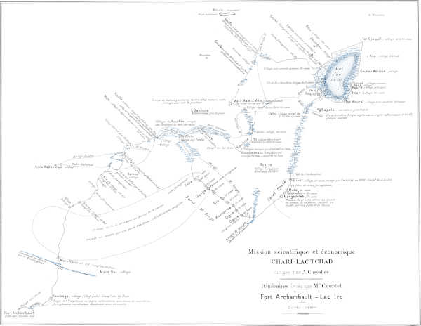 Aussitôt les pluies terminées, commencèrent nos voyages à travers les territoires du Tchad. Ils se sont déroulés pendant quinze mois. Environ 500 lieues des sentiers parcourus étaient pour la première fois foulés par des blancs.