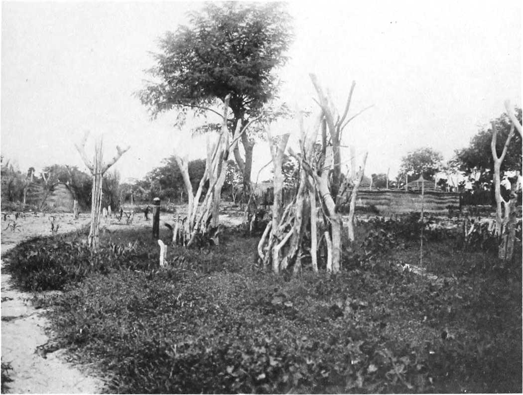 Le 2 septembre, en plein hivernage, nous parvenions à Fort-de-Possel à l’entrée du territoire du Tchad et presque aussitôt Martret installait un Jardin d’essais à Fort-Sibut. Ce[xiv] Jardin a ensemencé ou multiplié environ 460 espèces de plantes utiles, la plupart offertes gracieusement par la maison Vilmorin-Andrieux, le Muséum, le Jardin Colonial de Nogent, etc... Si les essais n’ont pas tous réussi, en revanche on peut considérer comme acclimatés le Mandarinier, le Bananier de Chine, le Papayer à gros fruits du Mexique, diverses variétés améliorées de Manguiers, un certain nombre de plantes ornementales, le Céara, pour ne citer que ceux-là.
