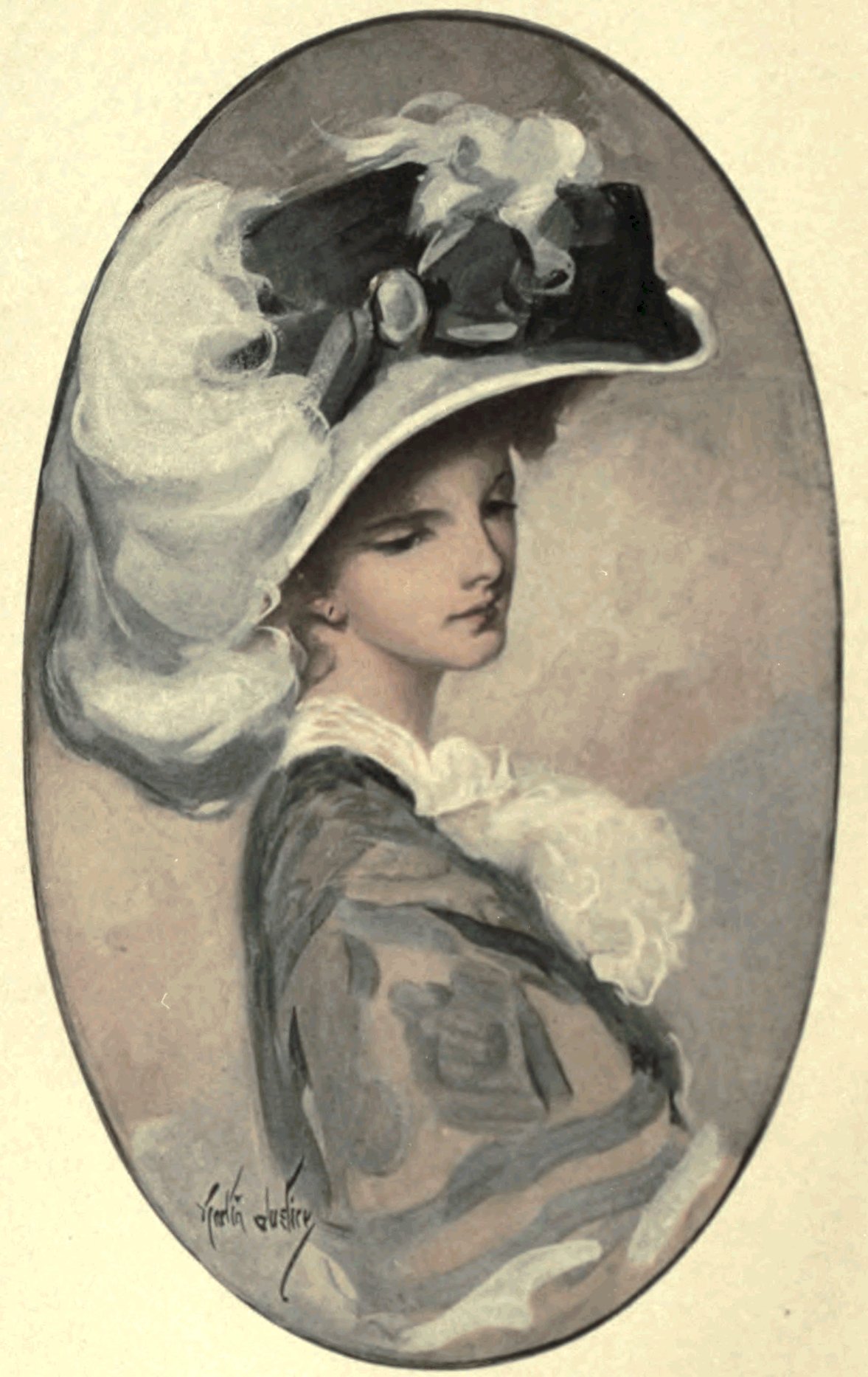 “‘A life on the ocean wave,’” Mrs. Faurie exclaimed joyously, as he turned a corner and came suddenly upon her. She had been rifling a wire flower-stand that lifted its redundant growths against the wall of the house, and she held in her hand a cluster of pink 419and white carnations. As she stood in the blended sheen of the bland day and the refulgent reflection of the blazing waters, she looked not unlike the bloom itself. She had upon her head a wide hat of delicate pink organdy, the brim variously bent and shirred and frilled, and her morning dress was of sheer white lawn. He strove within himself to avoid its recognition as the simplest toilet, such as any country girl might wear, for she took no grace from it, but embellished its every suggestion. Her slim, lissome figure lent it such distinction; the exquisite fairness of her complexion was so emphasized by the unrelenting clarity of the tints of her costume; the shoaling lights and shadows of her beautiful gray eyes, her rich brown hair piled high amongst the carnation-like frills of the hat, her delicate dewy lips, her dainty hand and arm and throat, all were more assertive in their demand for homage in the simple not to say stereotyped attire. And she looked scarcely twenty years old, as her laughing, long-lashed eyes met his.