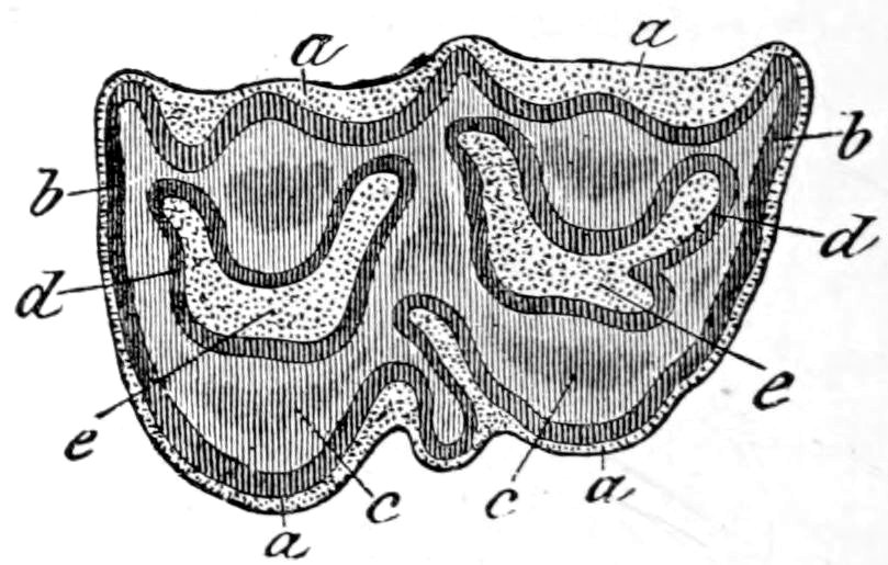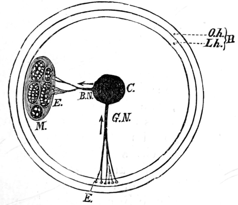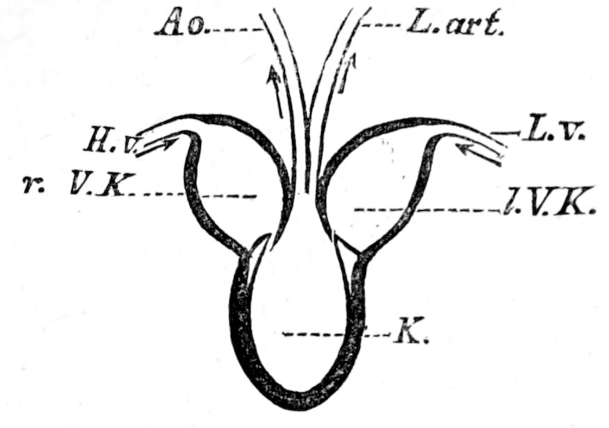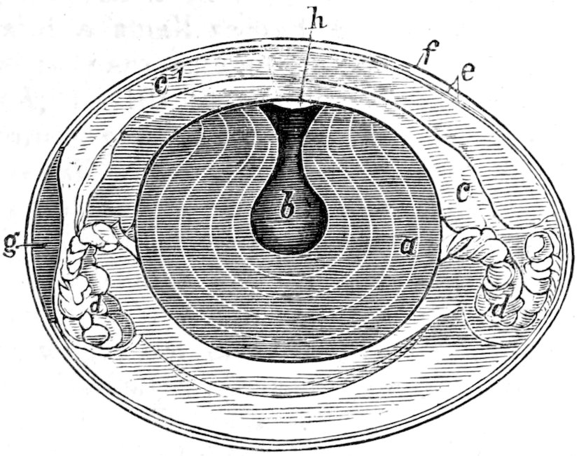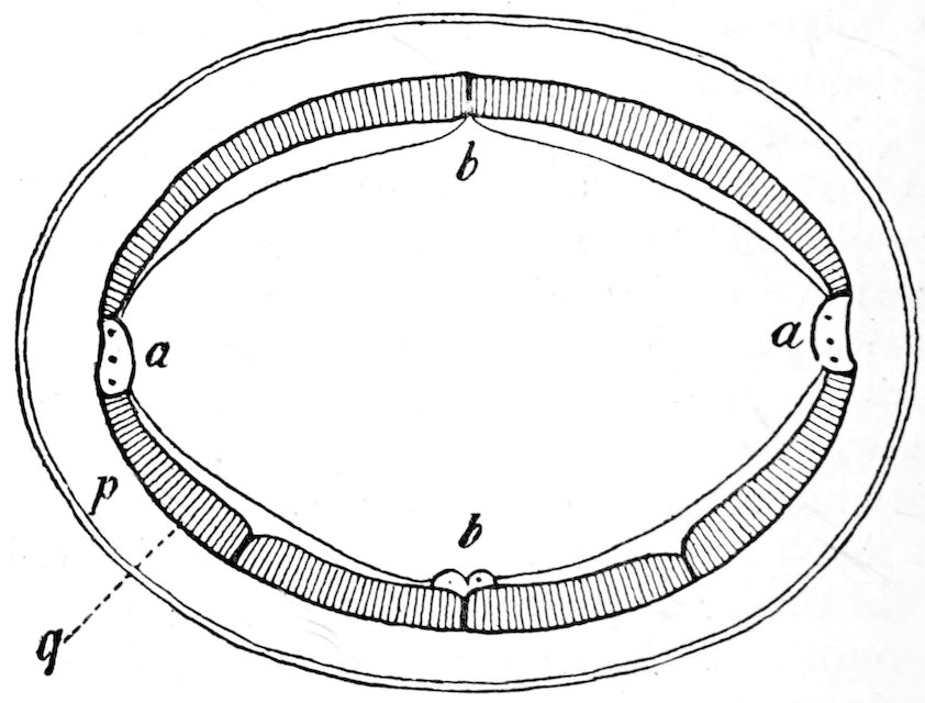 is at most scarcely one-sixth of an inch long, and consists of only three or four joints, often lives in large numbers in the intestine of the dog without injuring its host, but causes huge cysts (from the size of a pigeon’s egg to that of a child’s head) in the liver, lungs, or other organs of man, pig, and ruminants. These cysts are of the type represented 240on the right of Fig. 138. They may prove fatal, owing to the pressure they exert in the organs containing them and the blood-vessels of the same.