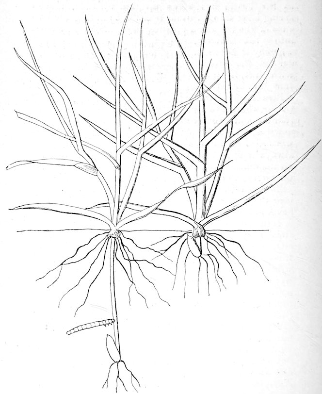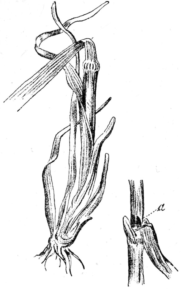 The eelworms producing the disease migrate into the soil on the ripening or death of the grain, and later on go back to the new young rye plants or to other plants in which they can live, as the case may be. It is therefore clear that (1) where this disease exists the soil is infected for a time, and (2), the eelworm disease of rye principally appears in regions where the culture of rye is carried on to excess. Germination of the seed corn goes on quite normally in infected fields, and it is only exceptionally that anything particular is noticed in the young plants of winter rye during autumn and winter. The disease appears at the beginning of spring. Some plants soon become yellow and die: others appear to grow very luxuriantly; they possess a beautiful bluish-green colour and seem very healthy; later on they develop enormously in breadth, and each separate plant covers a relatively large area. The base of the stem swells abnormally, so that the plant looks as if it bore below an onion projecting above the ground. This is caused by the lower joints of the haulm remaining very short and thickening considerably, causing the leaf-sheaths which surround the base of the stem to become thicker and broader than usual. The feeble development of roots is also characteristic. The leaves generally remain short, but get very thick; they often become wavy, and may even appear frilled. All the leaves, however, are not crumpled in this way; a few remain quite normal, while others are small and grass-like, but thick (Fig. 132). Later on, the tip of 222the haulm and the ear often do not come out of the leaf-sheaths; in other plants the ear may appear, but remains small and deformed as well as the rest of the haulm, while the grains which develop are small. A number of shoots, however, may develop normally and bear fruit. Badly infested plants quickly die, some at the very beginning of spring, others later.