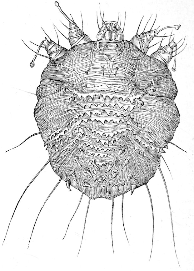(Fig. 141), is flat, but swollen in the middle, when it contains a large number of eggs, under which circumstances the edges only are flat. The last are of a dirty brown colour, while the middle of the body is greyish yellow. There is a triangular projection at the front end of the body with a sucker at the apex, 241and another at hinder end of the triangle. The outer surface of the body is covered with minute backwardly projecting spines, which present no hindrance to the forward creeping of the body in the bile-ducts, but make backward creeping or gliding impossible.