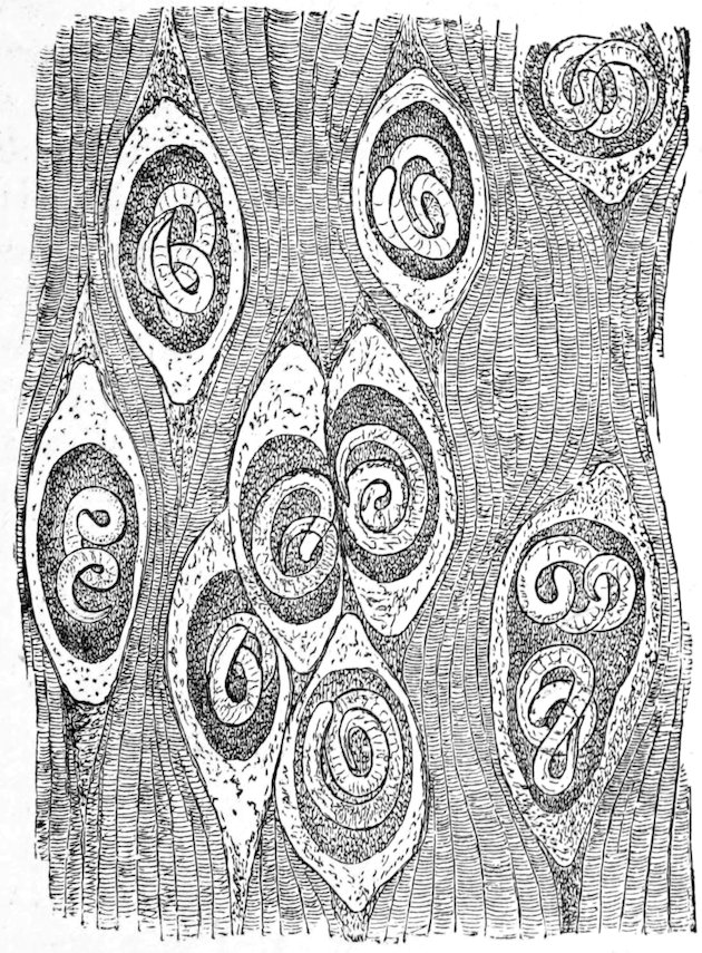 Six to ten feet long, with seven to eight hundred joints, and a circlet of hooks (Fig. 136), lives in the human intestine. Several of its sexually mature joints are commonly pinched off at a time, and if these are picked up from a field or dung-heap by a pig, the contained eggs develop into “pork measles” (Cysticercus, Fig. 140), which are especially abundant in the connective tissue between the muscles, and make the meat “measly.” They may also occur in the connective tissue of other parts (fat, brain, spinal cord). Young pigs not more than six months old are most in danger of becoming measly. A tolerably large number of measles can be borne very well, but if very 237abundant they cause emaciation, weakness, lameness, and poverty of blood. The flesh of an animal badly infested with measles may be pale, watery, or even greasy, while pork not so much diseased may seem all right, though it is really unfit for food, since if eaten in an insufficiently cooked state by human beings it would produce tapeworms. The measles are most abundant in the muscles of the breast and neck, and next to them in those of the hams and shoulders. From twelve to twenty thousand measles may be present in a single pig.