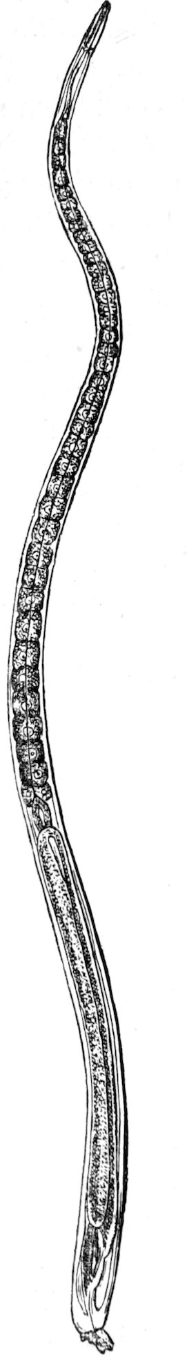 Length one-thirtieth to one-fifteenth of an inch long, usually of intermediate size; the two sexes of approximately equal length. Live and reproduce in various cultivated plants (e.g., rye, oats, stored onions, hyacinths, buckwheat, potatoes, clover, fuller’s teasel) and wild plants (e.g., Poa annua, Anthoxanthum odoratum, Dipsacus silvestris, Polygonum persicaria), but not to the same extent in all. It must also be added that eelworms of which the progenitors have developed for a considerable number of generations in the same plant, are not easily transferred to another kind of plant, or at any rate do not multiply vigorously there. Eelworms, of which the ancestors have lived for many years exclusively in rye, or alternately in rye and buckwheat, do not readily pass over to seedling onions, and first only reproduce in them to a small extent. The eelworms live only in stems, branches, and leaves, never in roots. In the places where they have penetrated the plant tissues an abnormal growth in thickness of the parts involved takes place, while the growth in length is either much diminished or even entirely stopped. Also the chlorophyll disappears sooner or later from the attacked spots, and rapid death generally ensues. Since only those parts of an organ which are inhabited by a large number of eelworms swell much, it is obvious that cracks are often developed in the stems and leaves concerned. It is further easily seen that the species and constitution of the infested plants will have an important influence on the progress of the disease caused by the eelworms. But since several generations of this parasite succeed one another 221during the same year, the resulting malformation is usually very considerable. “Clover sickness” is probably due to this eelworm.