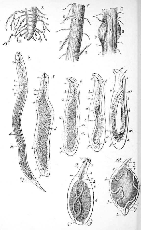 4. 227Fig. 134.—The Beet Eelworm (Heterodera Schachtii): 1, A beet root with adult females attached (natural size); 2, a lateral rootlet of beet which Eelworm larvæ (a) are penetrating (enlarged); 3, a lateral rootlet of beet with swelling (a) of the outer skin caused by the excessive development of larvæ which have previously entered it, and which have now become nearly mature females (enlarged); 4, a just-hatched larva; 5, a larva which has penetrated a root and swollen up into a club-shaped form; 6–8, development of the male; 9, a nearly adult and, 10, an adult female. The following letters have reference to Figs. 4–10: a, mouth spine,—b, sucking stomach (pharynx),—c, d, intestine,—e, f, rectum,—f, anus,—g, excretory organ; h (in Figs. 4–7), rudiments of the sexual organs in the undeveloped larvæ; h (in Fig. 8), testis; i (in Figs. 7 and 8), copulatory spicules of the male; k (Figs. 9 and 10), ovary; l (Figs. 9 and 10), female sexual opening; m, nerve ring; w1 (Figs. 6–8), larval skin; w2 (Figs. 6–8), new skin which the developing male forms within the larval skin. Figs. 4 and 5 are magnified more than Figs. 6–10.