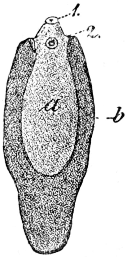 Flattened parasitic worms, tongue-shaped or leaf-shaped, living on or in a host, and provided with one or two ventral suckers. The intestine forks into two branches immediately behind the gullet, and these two divisions in some species (e.g. the large liver-fluke) branch again repeatedly in a tree-like fashion. Anus and blood-vessels absent. Almost all flukes are hermaphrodite; they fertilize themselves. All the forms living within a host (i.e. endoparasitic forms) lay an immense number of small eggs, from which larvæ are hatched that become asexually reproducing animals. These or their progeny produce once more the sexual form. The development is therefore an example of metagenesis (p. 16), but there is a change of host. Only the two liver-flukes need be dealt with here.