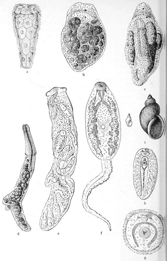 Fig. 142.—Liver Fluke: a, free-swimming ciliated larva; b, young Sporocyst, a few days after migration into the snail; c, sporocyst, containing rediæ in various stages of development; d, redia, containing balls of germinal cells; e, mature redia, containing its brood of cercariæ; f, mature cercaria; g, just-encysted cercaria; h, young fluke, soon after entering sheep; i, the water snail, Lymnæus truncatulus.
