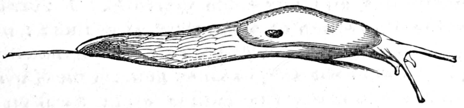 The Grey Field Slug (Limax agrestis, Fig. 144).—Four-fifths 249of an inch long, small and smooth, with dark tentacles, grey back, often a reddish sheen, and bright grey or white under side.
