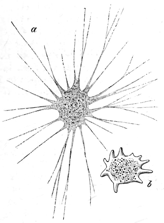Fig. 149.—Two species of Proteus Animalcule (Amœba), one with protoplasmic processes, slender and branched; the other with short blunt processes. Highly magnified.