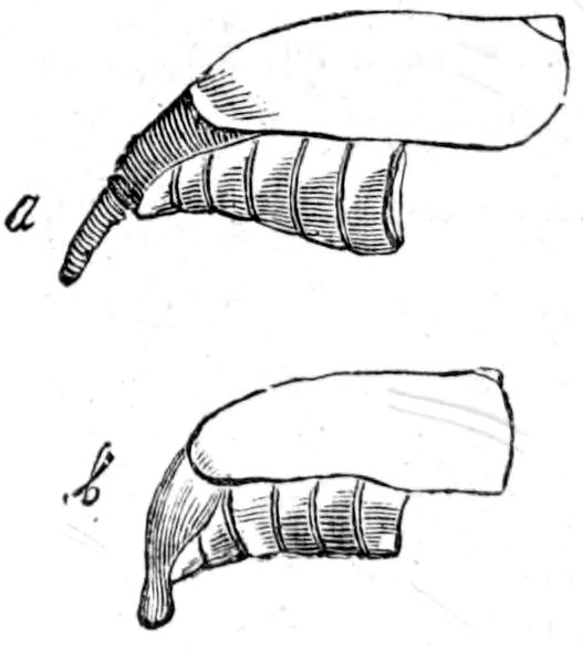 Remedies: Trepanning, as the bladders lie just underneath the roof of the skull. Prevention: Reducing the number of sheep-dogs; giving the dogs medicine to rid them of tapeworms in spring and summer; administering a specific to the yearling sheep in July and August, suitable for driving out any tapeworm larvæ which may be present in their intestines; burning (instead of burying) the heads of sheep affected with staggers which have died or been slaughtered. It is but rarely that all the larvæ living on the surface of the brain die between the first and second stages of the disease. A sheep affected by gid is therefore almost sure to die, and should be slaughtered as soon as possible. Compare “false gid,” p. 189.