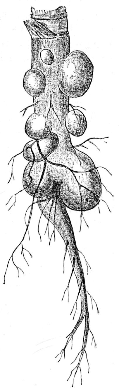 Clover Sickness is marked by short stunted shoots, and whitish rounded buds, often remaining closed; also by the whitish colour and abnormal thickening of the shoots and buds.
