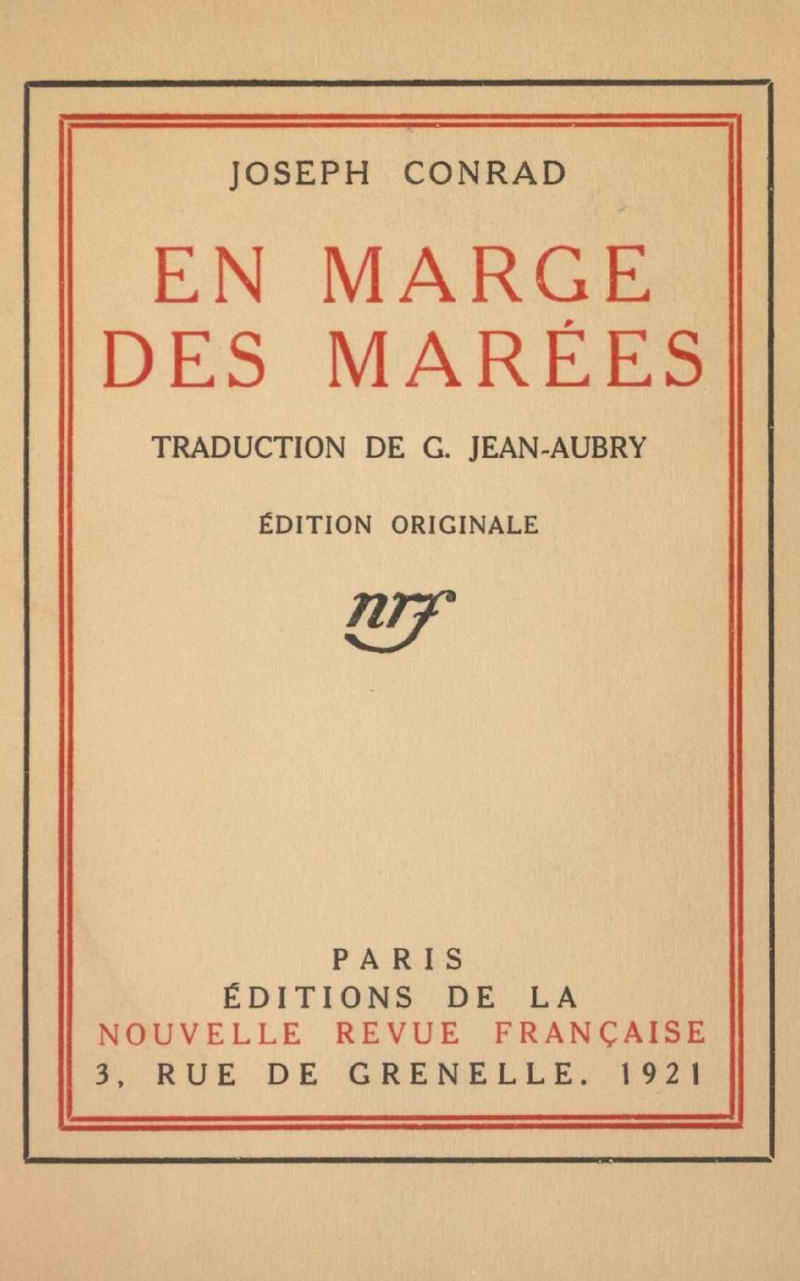 L’ouvrage dont nous donnons aujourd’hui la traduction a paru originalement sous le titre de Within the Tides[1] titre dont la version française la plus approchée eût été peut-être Entre flot et jusant. C’est d’accord avec M. Joseph Conrad que nous avons décidé d’adopter le titre très légèrement différent de En marge des marées qui répond également aux intentions de l’Auteur ; si la mer en effet apparaît bien dans les contes que réunit ce volume, elle n’en forme pas, comme dans d’autres ouvrages de l’écrivain, le lieu principal et le lien essentiel, elle ne fait ici figure que de comparse, présente, familière et indispensable, mais, cette fois, à l’arrière-plan du drame.
