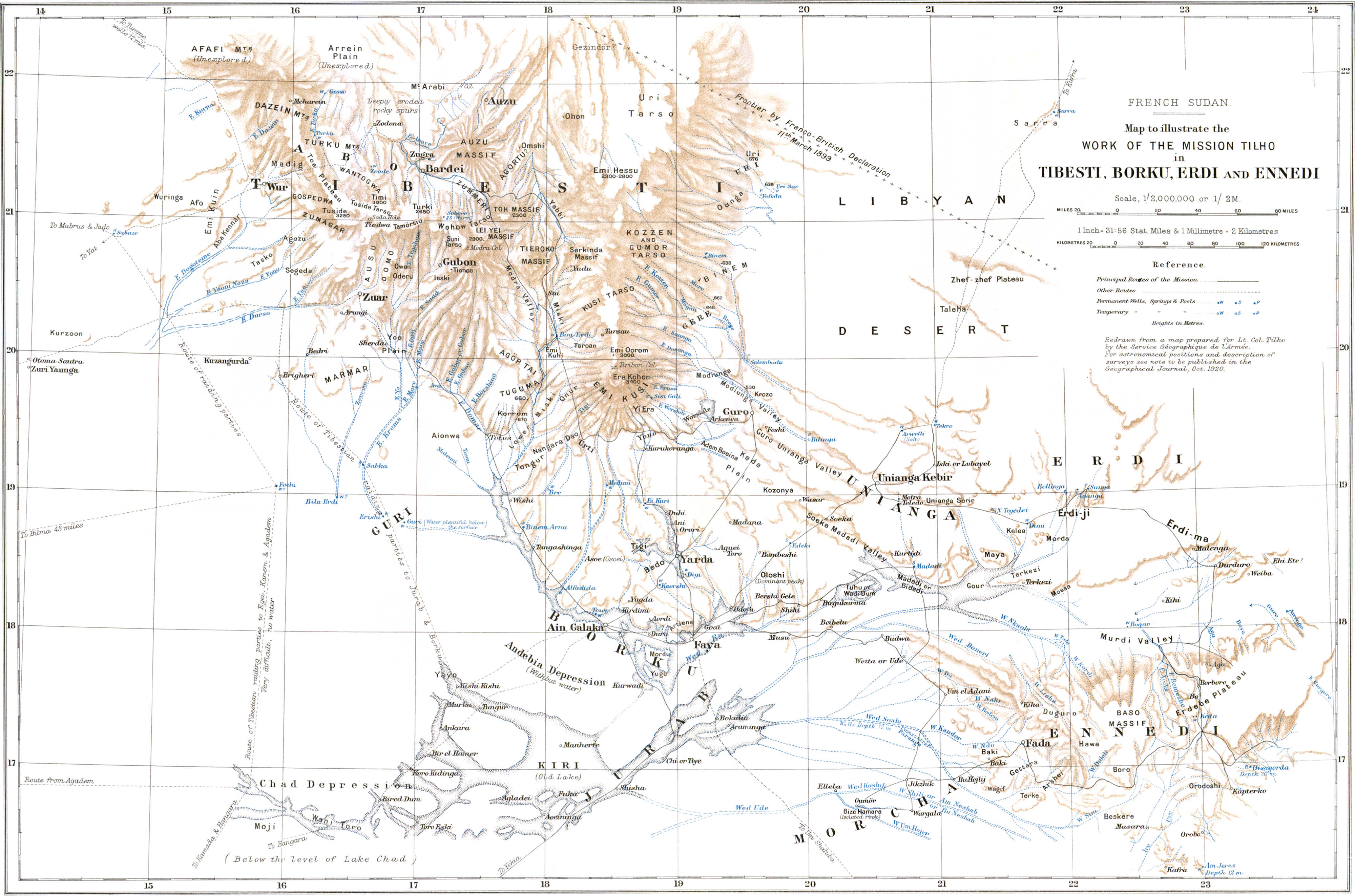 After drawing up the map of the western part of Borkou, subsequent to my reconnaissance in March and April of the various oases that succeed one another between Faya and Ain Galakka on the south and Gouro on the north, I devoted the last quarter of 1914 to an exploration of the unknown regions situated further east. Over and above their geographical interest, the said regions were of great military importance. My object was, in fact, to ascertain whether a counter-attack by the Senoussists, starting from Koufra and crossing the Libyan desert, could easily hope to escape the vigilance of our camel-corps patrols and fall on the remoter borders of Borkou and Ennedi.