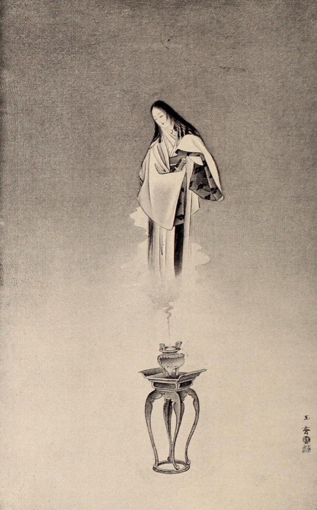 Curious indeed, but enormous by reason of it infinity of tradition and detail. I am afraid even to think of the size of the volume that would be needed to cover it…. Such a work would properly begin with some brief account of the earliest knowledge and use of aromatics in Japan. I would next treat of the records and legends of the first introduction of Buddhist incense from Korea,—when King Shōmyō of Kudara, in 551 A. D., sent to the island-empire a collection of sutras, an image of the Buddha, and one complete set of furniture for a temple. Then something would have to be said about those classifications of incense which were made during the tenth century, in the periods of Engi and of Tenryaku,—and about the report of the ancient state-councillor, Kimitaka-Sangi, who visited China in the latter part of the thirteenth century, and transmitted to the Emperor Yomei the wisdom of the Chinese concerning incense. Then mention should be made of the ancient incenses still preserved in various Japanese temples, and of the famous fragments of ranjatai (publicly exhibited at Nara in the tenth year of Meiji) which furnished supplies to the three great captains, Nobunaga, Hideyoshi, and Iyeyasu. After this should follow an outline of the history of mixed incenses made in Japan,—with notes on the classifications devised by the luxurious Takauji, and on the nomenclature established later by Ashikaga Yoshimasa, who collected one hundred and thirty varieties of incense, and invented for the more precious of them names recognized even to this day,—such as “Blossom-Showering,” “Smoke-of-Fuji,” and “Flower-of-the-Pure-Law.” Examples ought to be given likewise of traditions attaching to historical incenses preserved in several princely families, together with specimens of those hereditary recipes for incense-making which have been transmitted from generation to generation through hundreds of years, and are still called after their august inventors,—as “the Method of Hina-Dainagon,” “the Method of Sentō-In,” etc. Recipes also should be given of those strange incenses made “to imitate the perfume of the lotos, the smell of the summer breeze, and the odor of the autumn wind.” Some legends of the great period of incense-luxury should be cited,—such as the story of Sué Owari-no-Kami, who built for himself a palace of incense-woods, and set fire to it on the night of his revolt, when the smoke of its burning perfumed the land to a distance of twelve miles…. Of course the mere compilation of materials for a history of mixed-incenses would entail the study of a host of documents, treatises, and books,—particularly of such strange works as the Kun-Shū-Rui-Shō, or “Incense-Collector’s Classifying-Manual”;—containing the teachings of the Ten Schools of the Art of Mixing Incense; directions as to the best seasons for incense-making; and instructions about the “different kinds of fire” to be used for burning incense—(one kind is called “literary fire,” and another “military fire”); together with rules for pressing the ashes of a censer into various artistic designs corresponding to season and occasion…. A special chapter should certainly be given to the incense-bags (kusadama) hung up in houses to drive away goblins,—and to the smaller incense-bags formerly carried about the person as a protection against evil spirits. Then a very large part of the work would have to be devoted to the religious uses and legends of incense,—a huge subject in itself. There would also have to be considered the curious history of the old “incense-assemblies,” whose elaborate ceremonial could be explained only by help of numerous diagrams. One chapter at least would be required for the subject of the ancient importation of incense-materials from India, China, Annam, Siam, Cambodia, Ceylon, Sumatra, Java, Borneo, and various islands of the Malay archipelago,—places all named in rare books about incense. And a final chapter should treat of the romantic literature of incense,—the poems, stories, and dramas in which incense-rites are mentioned; and especially those love-songs comparing the body to incense, and passion to the eating flame:—