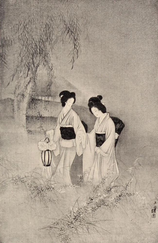 Nearly two hundred and fifty years ago, the daughter of a rich merchant of the city of the Shōguns, while attending some temple-festival, perceived in the crowd a young samurai of remarkable beauty, and immediately fell in love with him. Unhappily for her, he disappeared in the press before she could learn through her attendants who he was or whence he had come. But his image remained vivid in her memory,—even to the least detail of his costume. The holiday attire then worn by samurai youths was scarcely less brilliant than that of young girls; and the upper dress of this handsome stranger had seemed wonderfully beautiful to the enamoured maiden. She fancied that by wearing a robe of like quality and color, bearing the same crest, she might be able to attract his notice on some future occasion.