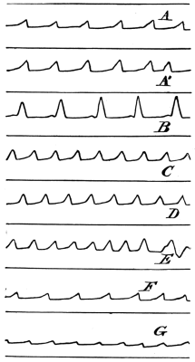 F and G show very marked diminution in the force, but the number of pulsations not over 72 per minute; G particularly so, the heart needing the stimulus of the oxygen for full power.
