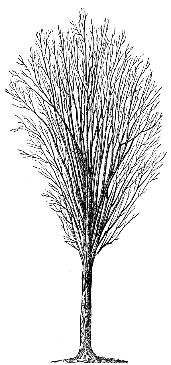 "Having left Ispahan, in order to explore the province of Ghilan, he found this tree in the forests which he traversed before arriving at Recht, a town situated on the Caspian Sea. In this town he had opportunities of remarking the use made of the wood, and of judging how highly it was appreciated by the inhabitants." The first tree introduced into Europe appears to have been planted by M. Lemonnier, Professor of Botany in the Jardin des Plautes, etc., in his garden near Versailles. This garden was destroyed in 1820, and the dimensions of the tree when it was cut down were as follows: Height 70 feet, trunk 7 feet in circumference at 5 feet from the ground. The bole of the trunk was 20 feet in length and of nearly uniform thickness; and the proportion of heart-wood to sap-wood was about three quarters of its diameter. This tree was about fifty years old, but was still in a growing state and in vigorous health. The oldest tree existing in France at the time of the publication of Loudon's great work, was one in the Jardin des Plantes, which in 1831 was about 60 feet high. It was planted in 1786 (when a sucker of four years old), about the same time as the limes which form the grand avenue called the Allee de Buffon. "There is, however, a much larger Zelkowa on an estate of M. le Comte de Dijon, an enthusiastic planter of exotic trees, at Podenas, near Nerac, in the department of the Lot et Garonne. This fine tree was planted in 1789, and on the 20th of January, 1831. it measured nearly 80 feet high, and the trunk was nearly 3 feet in diameter at 3 feet from the ground." A drawing of this tree, made by the count in the autumn of that year, was lent to Loudon by Michaux, and the engraving prepared from that sketch (on a scale of 1 inch to 12 feet) is herewith reproduced. At Kew the largest tree is one near the herbarium (a larger one had to be cut down when the herbarium was enlarged some years ago, and a section of the trunk is exhibited in Museum No. 3). Its present dimensions are: height, 62 feet; circumference of stem at 1 foot from the ground, 9 feet 8 inches; ditto at ground level, 10 feet; Height of stem from ground to branches, 7 feet; diameter of head, 46 feet. The general habit of the tree is quite that as represented in the engraving of the specimen at Podenas. The measurements of the large tree at Syon House were, in 1834, according to Loudon: Height, 54 feet; circumference of of stem, 6 feet 9 inches; and diameter of head, 34 feet; the present dimensions, for which I am indebted to Mr. Woodbridge, are: Height, 76 feet; girth of trunk at 2½ feet from ground, 10 feet; spread of branches, 36 feet.