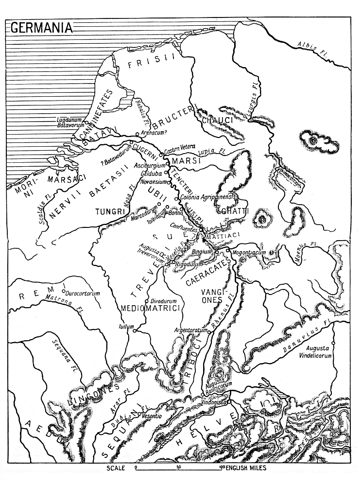 | Caecina marches to meet the invasion. (Valens aegrotat.) His Legions are I, IV Macedonica, XV Primigenia, XVI, V Alaudae, XXII Primigenia, I Italica, XXI Rapax, and detachments from Britain. | ||