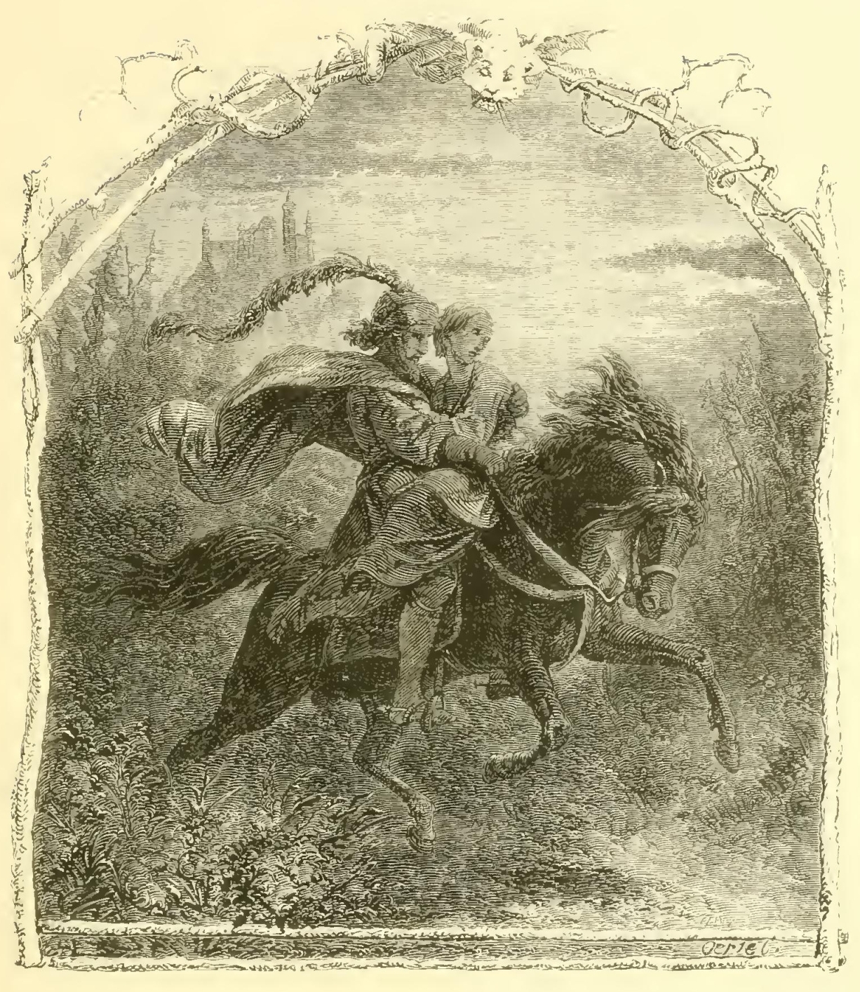 As yet the panic of the steed had given his unskillful rider an apparent advantage in the chase; but just as he had got halfway through the hollow the girths of the saddle gave away and he felt it slipping from under him. He seized it by the pommel and endeavored to hold it firm, but in vain, and had just time to save himself by clasping old Gunpowder round the neck, when the saddle fell to the earth, and he heard it trampled under foot by his pursuer. For a moment the terror of Hans Van Ripper’s wrath passed across his mind, for it was his Sunday saddle; but this was no time for petty fears; the goblin was hard on his haunches, and (unskilled rider that he was) he had much ado to maintain his seat, sometimes slipping on one side, sometimes on another, and sometimes jolted on the high ridge of his horse’s back-bone with a violence that he verily feared would cleave him asunder.