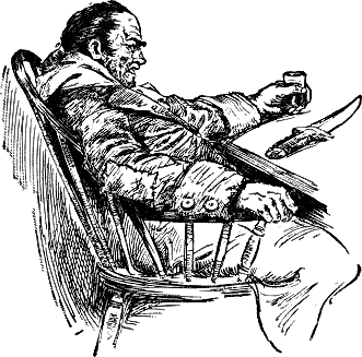 But though I was so terrified by the idea of the seafaring man with one leg, I was far less afraid of the captain himself than anybody else who knew him. There were nights when he took a deal more rum and water than his head would carry; and then he would sometimes sit and sing his wicked, old, wild sea-songs, minding nobody; but sometimes he would call for glasses round, and force all the trembling company to listen to his stories or bear a chorus to his singing. Often I have heard the house shaking with "Yo-ho-ho and a bottle of rum," all the neighbors joining in for dear life, with the fear of death upon them, and each singing louder than the other to avoid remark. For in these fits he was the most overriding companion ever known; he would slap his hand on the table for silence all around; he would fly up in a passion of anger at a question, or sometimes because none was put, and so he judged the company was not following his story. Nor would he allow anyone to leave the inn till he had drunk himself sleepy and reeled off to bed.