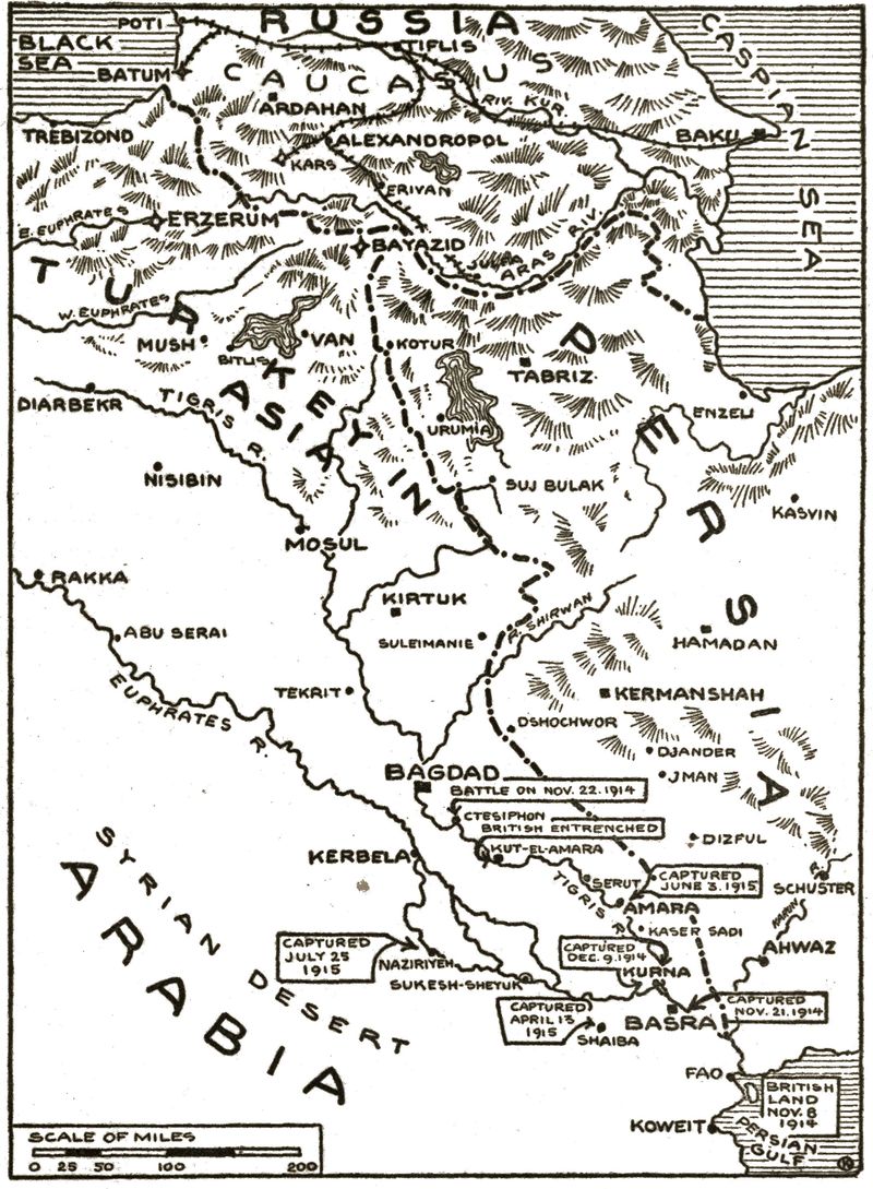 While this fighting was taking place in the north, farther to the south toward the Persian frontier the Russians were attempting a turning movement against the Turkish right flank. At the same time that the Russian force in the north crossed the Turkish frontier the Russian column entered Turkey fifty miles farther southeast. On November 8, 1914, this force entered the Turkish town of Kara Kilissa. A week later, making its way southwest for a distance of twenty miles, it engaged, (p. 014) near the village of Dutukht, a Turkish force composed largely of Arab troops of the Thirteenth Corps. At the outset the Russians met with a measure of success, but on November 22, 1914, the Turks, having been reenforced by troops from Bagdad, began a fierce offensive. After indecisive fighting in the Alashgird valley the Turks, about the middle of December, 1914, almost caught the Russians in a bold enveloping movement north of Dutukht. In order to escape the Russians were compelled to retreat hurriedly and thus ended their offensive operation in this section.