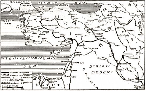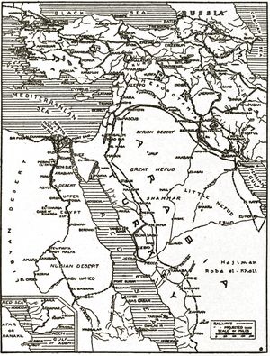In June, 1915, Colonel von Laufer and a mixed force attempted a feeble raid on the canal near El Kantara, but were driven off with some loss by the Yeomanry, who had done effective work in keeping the enemy away from the British lines. A mine having been found near the canal about this time, the Porte informed the neutral powers that the canal must be closed to navigation owing to the arbitrary conduct of the British in Egypt. But the Turks were not in a position to carry out their threats, owing to the vigorous attack on the Dardanelles. Troops were hurried from Syria to Constantinople, and by June 6 less than 25,000 Turkish troops remained in central and southern Syria and the Sinai Peninsula. At Nakhl and El Arish there were left about 7,000 veteran desert fighters, but the British air scouts kept a watchful eye on the desert roads, and used bombs with such (p. 015) effect that the Turks were kept in a constant state of apprehension by their attacks.