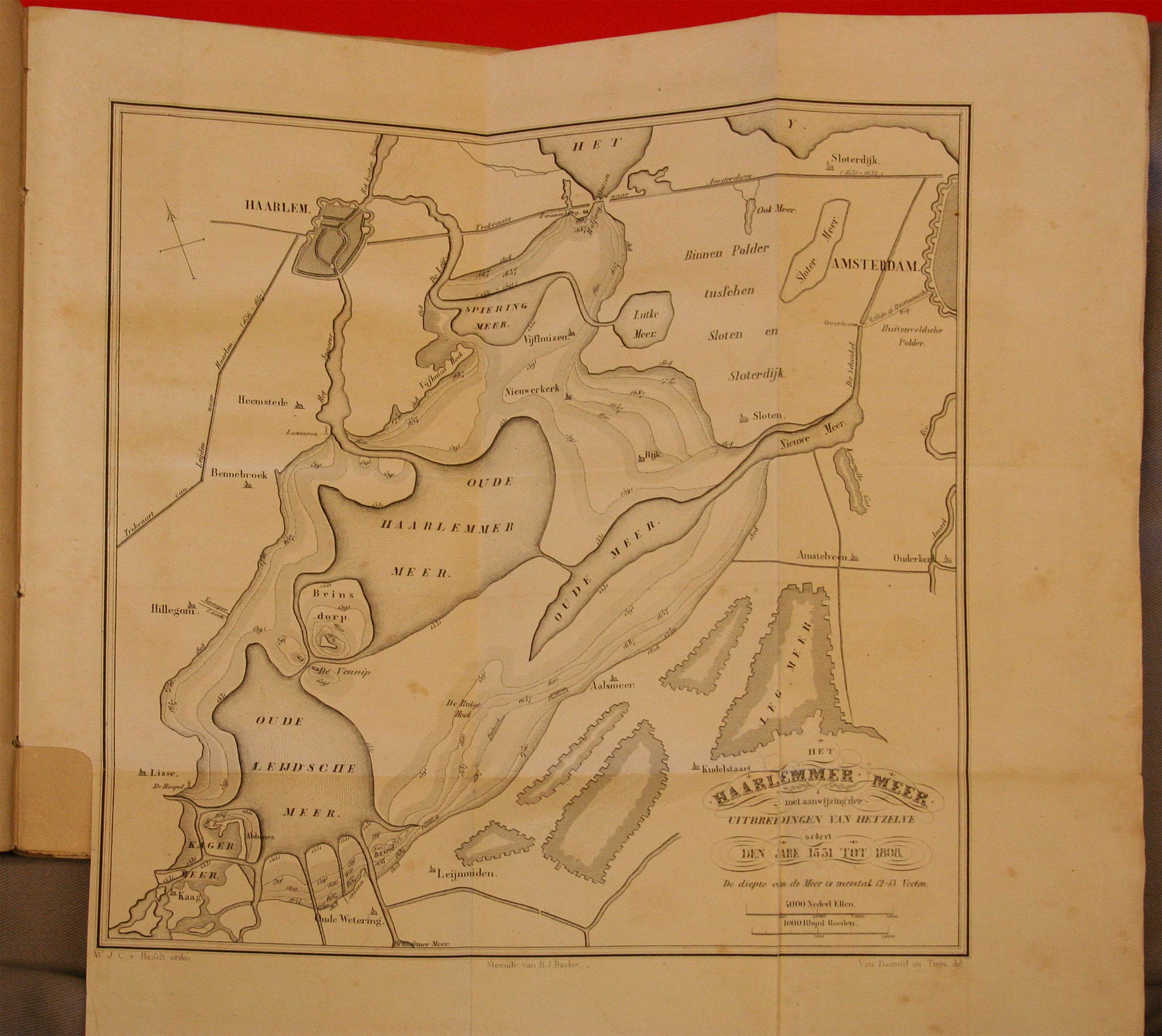 In de XVIde eeuw was het Haarlemmer Meer nog slechts een plas van 3040 morgen, en afgescheiden van het Leidsche-, het Spiering- en het oude Meer, uit welke het sedert is zamengesteld. Al deze Meren besloegen in den jare 1531, volgens de kaart door den Landmeter van Rhijnland, Melchior Bolstra, opgemaakt, te zamen 6585 morgen. Weldra werden deze Meren door de kracht hunner wateren veréénigd; zij bedekten in 1591 reeds 12375, in 1647, 17082, en in 1687, 18100 morgen. Toen voormelde Bolstra in de jaren 1739 en 1740, op hoog bevel, de vier Meren mat, vond hij, dat 19,500 [6]morgen lands door die wateren waren bedekt, en bij de opmeting in 1808, door den Heer A. Blanken Jsz., is het vereenigd Meer, thans bekend onder den naam van Haarlemmer Meer, met het Kager Meer bevonden eene oppervlakte van 20872 morgen te beslaan, zonder daarbij te rekenen het Lutke Meer, dat 323 morgen groot is3. Een aanwas alzoo van bijna 15000 morgen op 6000, gedurende den tijd van drie eeuwen.