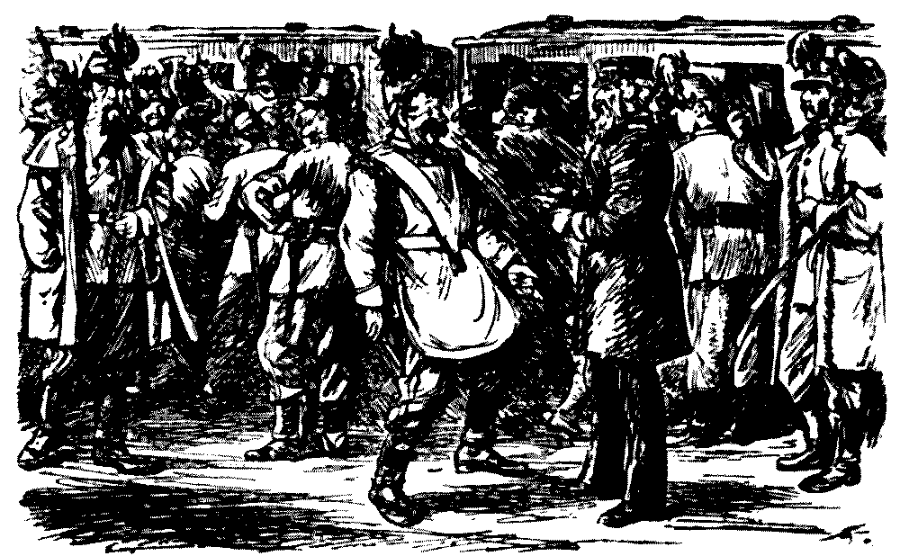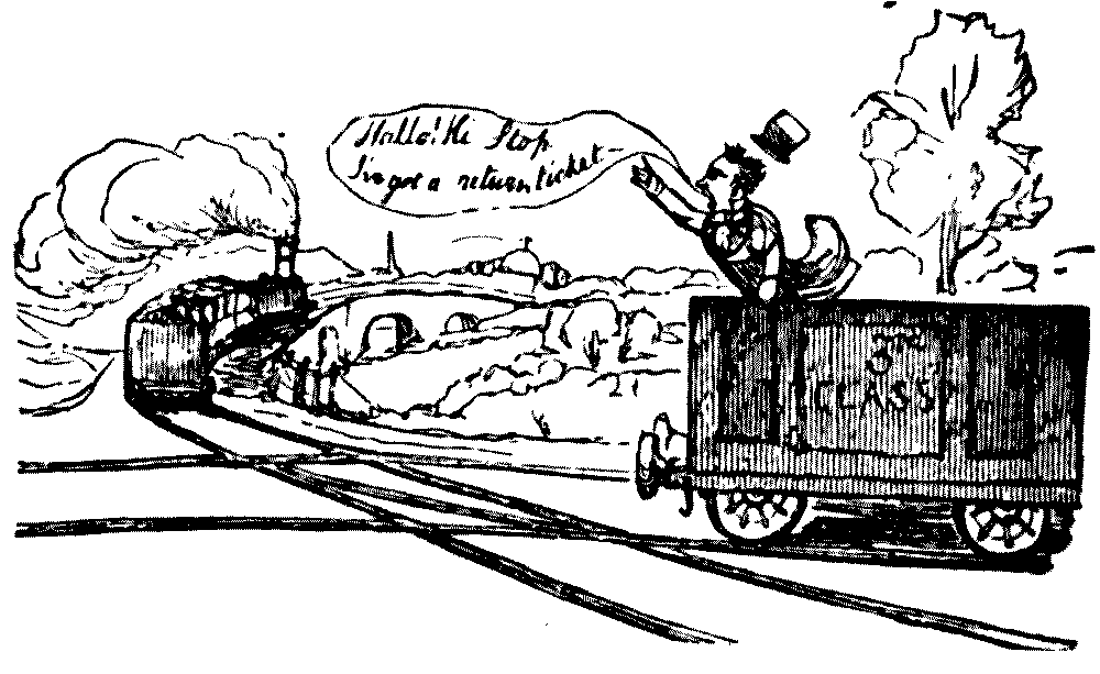 A Comical Meal.—On a long journey promise that the train shall stop at a stated station ten minutes for refreshments. Lose time in the customary manner, and allow the train to arrive at the stated station half an hour late. Permit the passengers to descend and to enter the refreshment-rooms. The moment they are served, drive them back hurriedly into the carriages with the threat that if they are not immediately seated in their places they will be left behind. When the passengers are once more in their compartments, the carriage-doors should be securely locked, and the train can then remain waiting beside the platform for three-quarters of an hour.