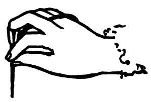 To sew a button on securely you should make a[5] pin-hole where the button is to be placed. A four-hole white button is the easiest to work on. Thread a No. 7 needle with a length of No. 40 white sewing cotton, bring the ends together and make a knot. The right length thread is measured from the tip of the thimble finger to the elbow. When a thread is used double it should be twice the length of this. A neat knot is made by holding the threaded needle in the right hand and by taking the end or ends, as the case may be, between the thumb and first finger of the left hand. Keep the thread tightly stretched, wind it around the top of the first finger, then move the finger down the thumb, carrying the thread with it about half an inch. Now with the nail of the second finger bring the knot thus formed to the end of the thread.