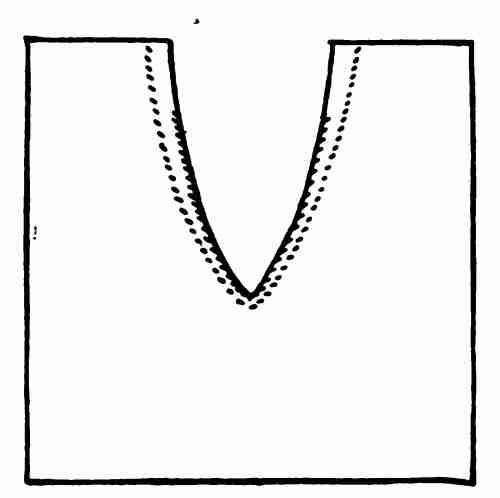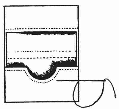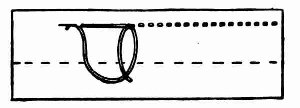 Your needle should slant as shown in the diagram (Figure 19). Take a stitch right through all the thicknesses of the material. Be sure that it goes[19] through to the other side. The fewer the threads taken on the needle at the same time, the neater the result will be. The stitches should slant from right to left. The stitches must be close together if we want fine hemming. Let each stitch be the same size as the other and slant in the same direction. The right side of the hem looks like a row of short dashes.