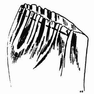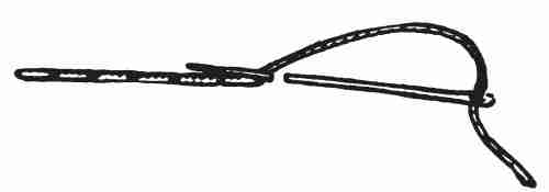 In places where there will not be much strain we use a quicker stitch, which is called the half-back stitch (Figure 11). This is very much like the stitching of which I have been telling you. The wrong side will look about the same, but on the right side[14] instead of the stitches touching there will be a space, then a stitch of equal length.