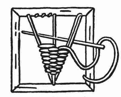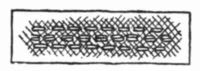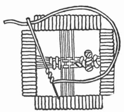 If you will take a card three inches square and[9] prick a line of dots half an inch from the top and bottom edges and prick a line a quarter of an inch apart you will have a little loom. The dots must be directly under each other. A piece of coloured worsted and a large-eyed crewel needle No. 2 will be required. Make a knot at the end of your thread and start from the upper right hand hole on the wrong side. Bring your thread up through the hole and down through the lower right-hand dot. The needle must now come up through the next hole at the bottom and the thread be again stretched across the card.