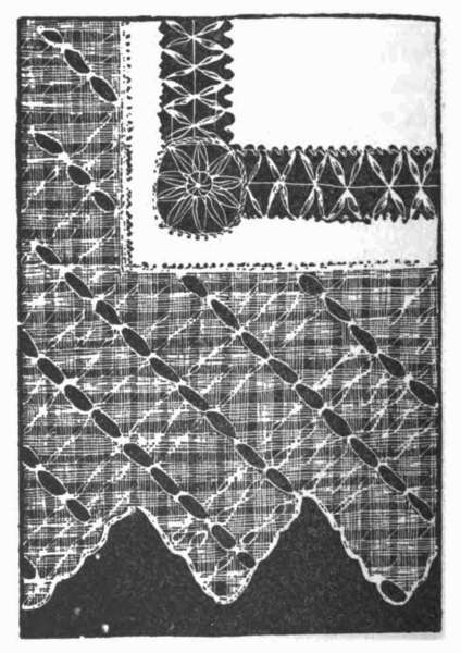 For the girl who has a window seat in a room and wants to keep her room dainty and bright there is[375] nothing as pretty as the lingerie pillow. It may be made of heavy white linen or lawn as you desire and can be oblong, round or square. The cushion is covered in any colour that you prefer and the white top embroidered with large eyelets, Roman cut work, Hardanger or drawn work so that the colour will appear through the openings. Some of the handsomest imported pillows have motifs of real Filet, Irish Crochet or Cluny lace. These motifs are very expensive and not really necessary. The back and front of the linen cover are scalloped on the edges and half an inch above this scalloping a row of large eyelets is worked at intervals. The back and front are laced together with ribbons the same shade as the coloured covering. For a pink and blue room the cushion can be covered with pink and the lingerie slip laced with blue. For a square pillow plan the design on a square and arrange one in each corner and one in the direct centre.