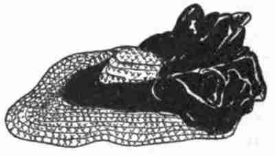 Crown—Knit 29 stitches, knit 2 together; turn, knit 14 stitches, knit 2 together. Repeat until all side stitches have been worked up and the crown is complete. Then pick up stitches on both[363] ends, first on one side; turn, knit them plain, also the crown stitches, then pick up the stitches on that side and knit them. Make a row of holes for ribbon, yarn over needle twice, then knit 2 together to end of row. 1 row plain, knitting only 1 of the stitches cast on. With blue yarn crochet 1 row, 3 chain, 1 single.