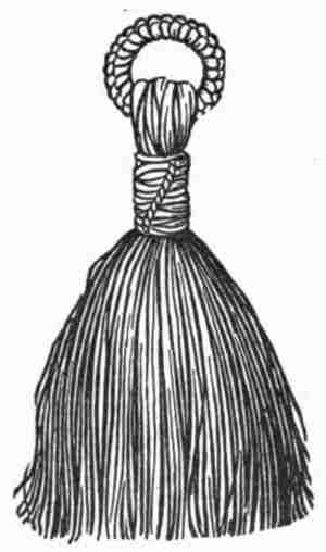 One of the handsomest fraternity pillows I ever saw, was one belonging to a Hamilton College man. Hamilton's colours are buff and bright deep blue. The fraternity's colours were black and gold. A handsome piece of Hamilton blue broadcloth was selected for the background. The fraternity pin was reproduced in colour in fine filo silk. The gold silk was a perfect match to the gold in the pin. Even the background of the pin, which was black enamel, was represented by very fine Kensington[377] stitches. The rope-like edge of the pin was reproduced on the pillow by little rope-like sections heavily padded and worked in gold silk. On the back of the pillow were his initial and his class year below. No beruffled ribbons or gaudy cord detracted from its richness. It was a square cushion and its only finish was a large button in each corner where the end was gathered and tucked in to give a round effect.