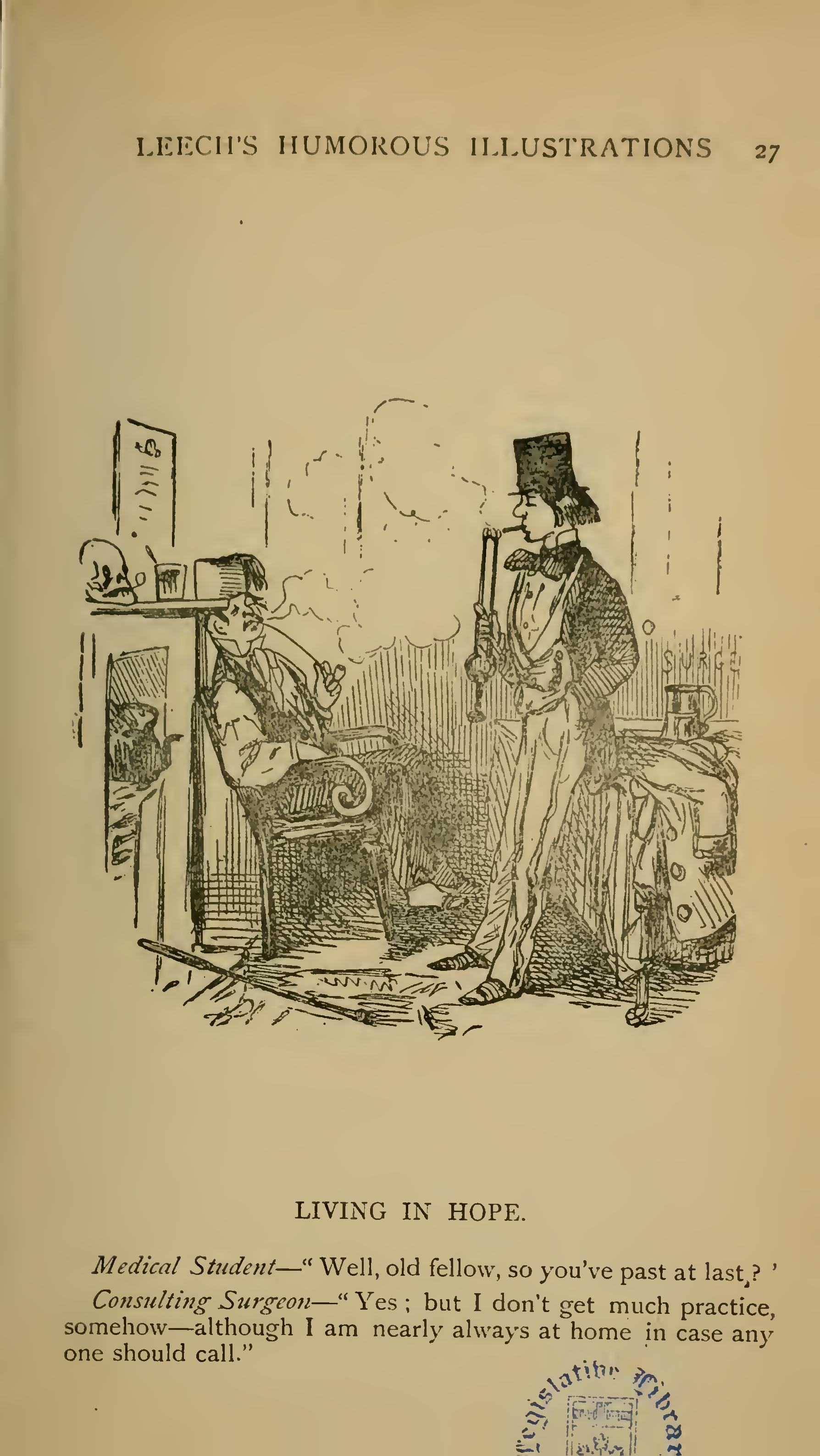 At sixteen years of age, young Leech left Charterhouse, and, notwithstanding Flaxman's advice that the boy should follow the profession of an artist, his father put him to the medical profession at St. Bartholomew's, under Mr Stanley, the surgeon of the Hospital. After a time he was placed under Mr Whittle, an eccentric practitioner at Hoxton, and subsequently under Dr John Cockle, afterwards physician to the Royal Free Hospital. Throughout his various situations, young Leech become famous among his fellow students and friends for his extremely clever—and, at the same time, always good-natured—caricatures. He was for ever drawing scenes, characters, and incidents in daily life. About this time, young Leech's liking for horses probably received its first development, through his friendship with Mr Charles Adams. Mr Adams was the owner of two horses which it was his delight to drive tandem fashion, and in his excursions Leech was his constant companion. To this circumstance we are, no doubt, partially indebted for many of the clever bits of driving and country road life depicted by the pencil of the artist. At this early period of his career, Leech made numerous life friendships with men who afterwards became distinguished. Notable among these men were Albert Smith and Percival Leigh.